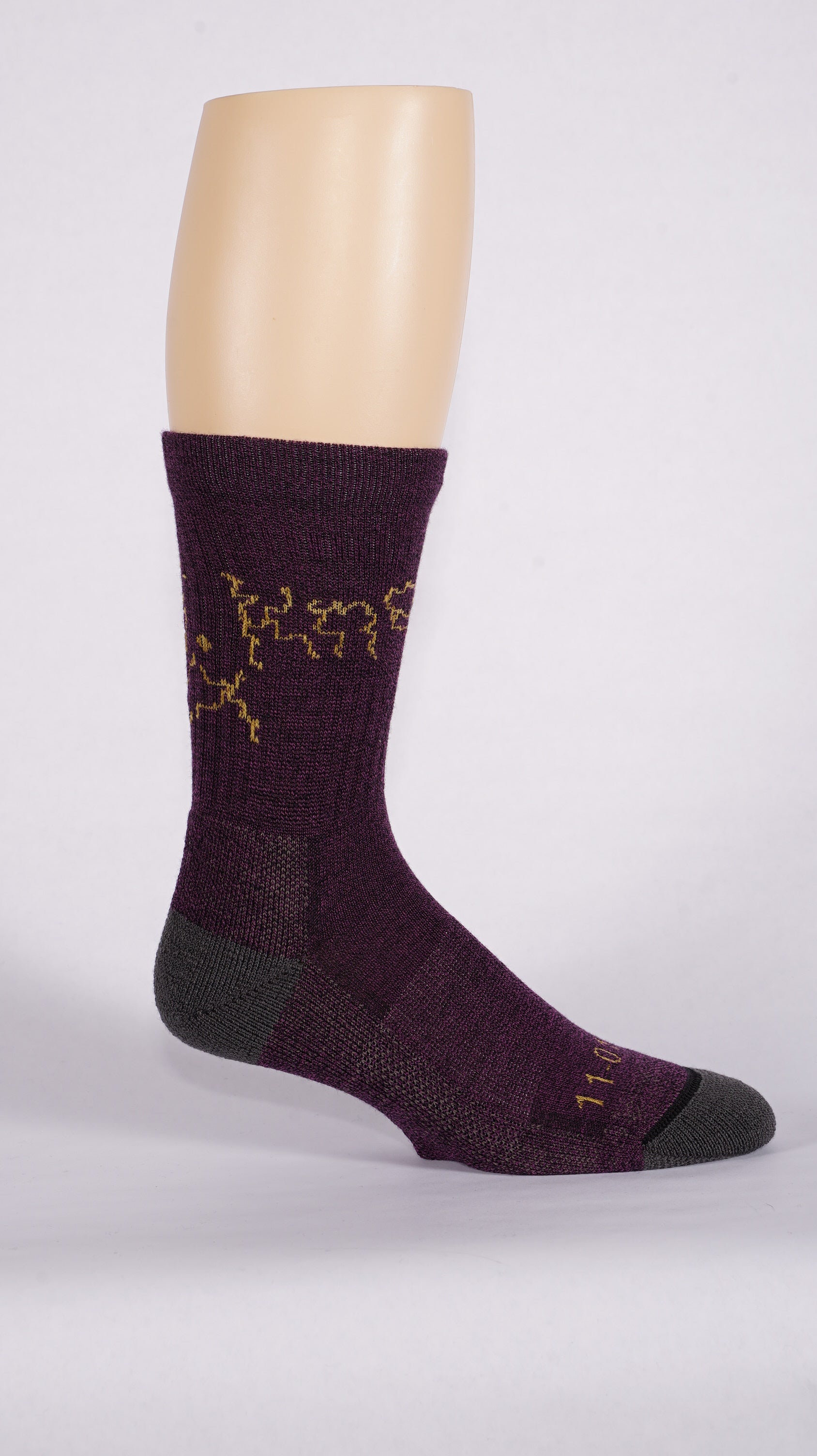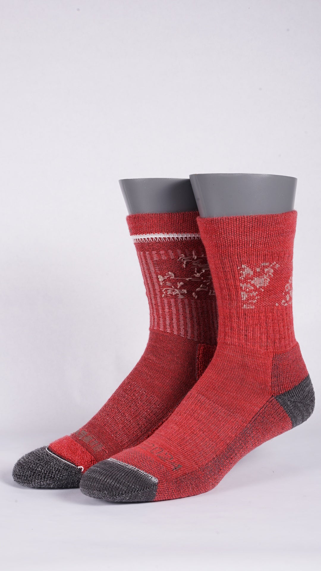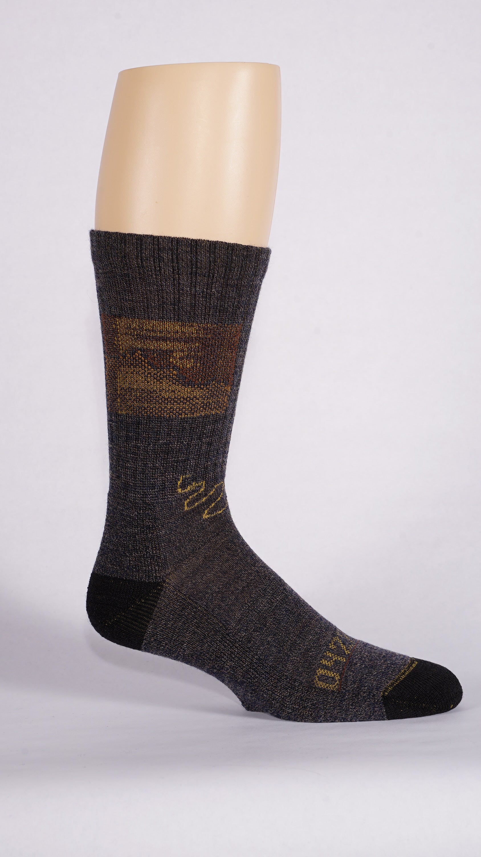 Assortment of colors in limited stock merino wool yarn in this classic boot construction. Reinforced heel, toe, and foot bottom provide durability and support. Elasticized 3x1 rib leg and arch support for unparalleled fit. Zippy contrast white nylon flat toe seam, variations on the box motif in the knit leg and topped with a pique 1x1 cuff, a knestknit classic.