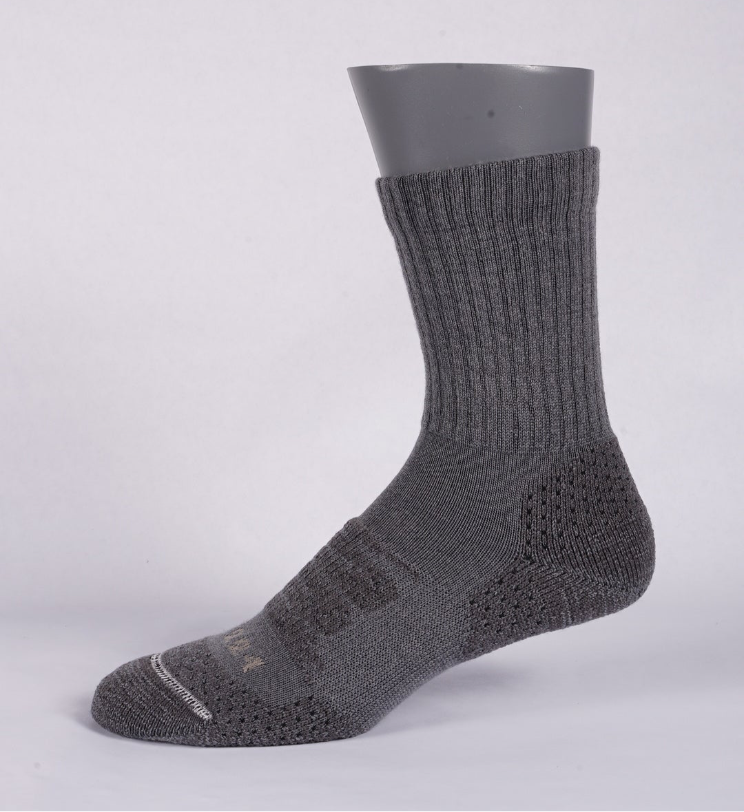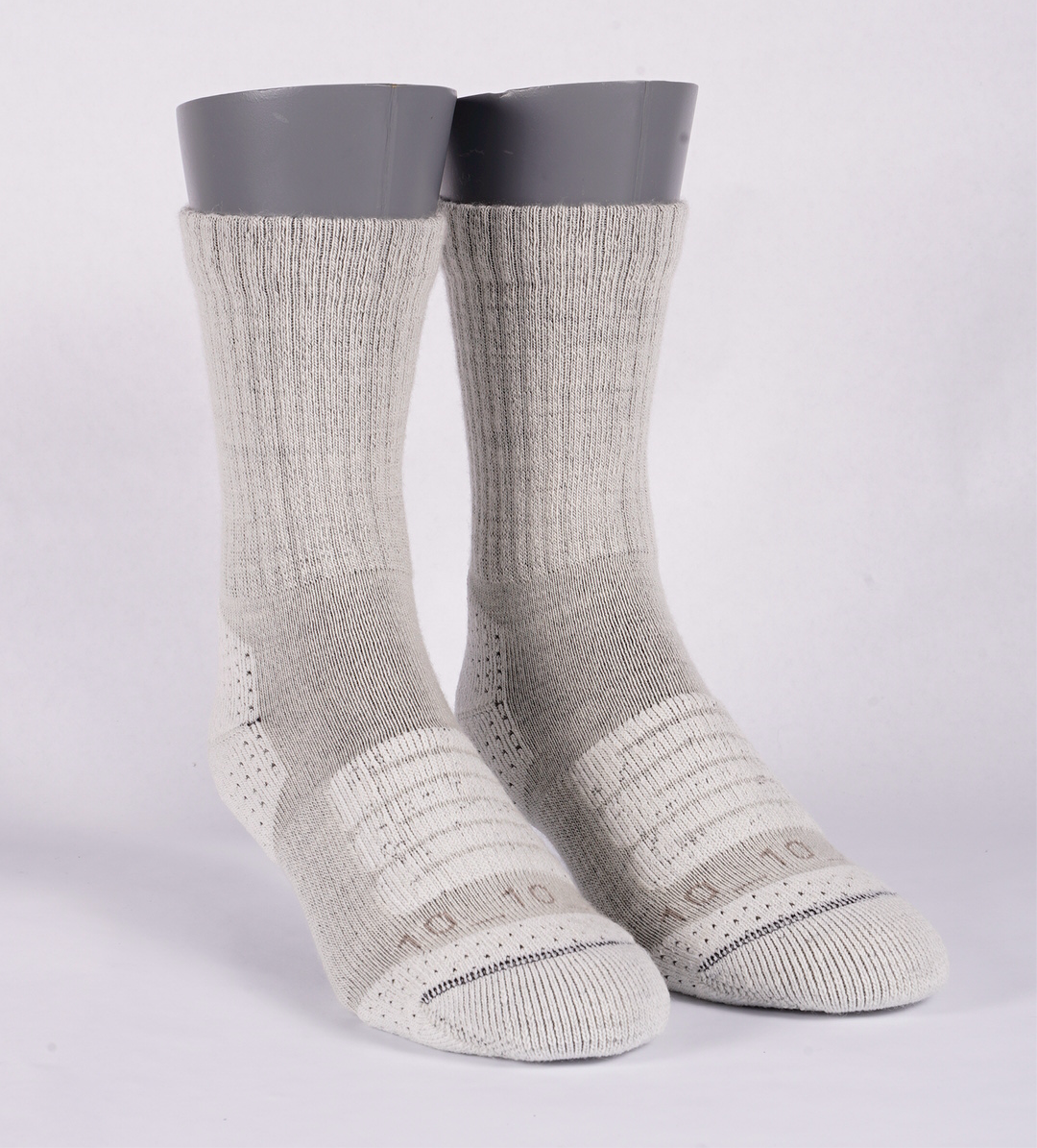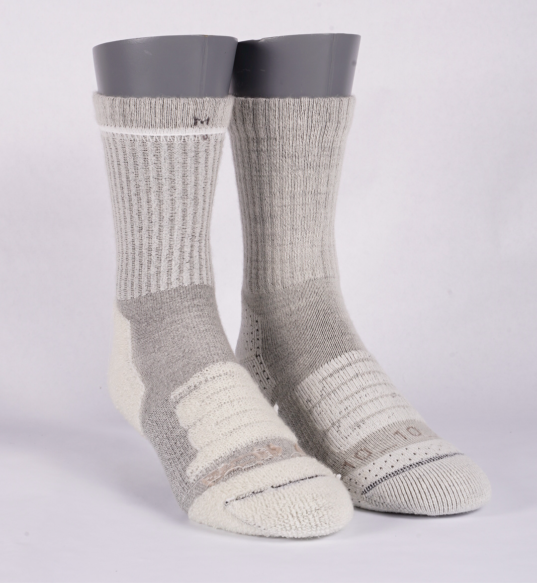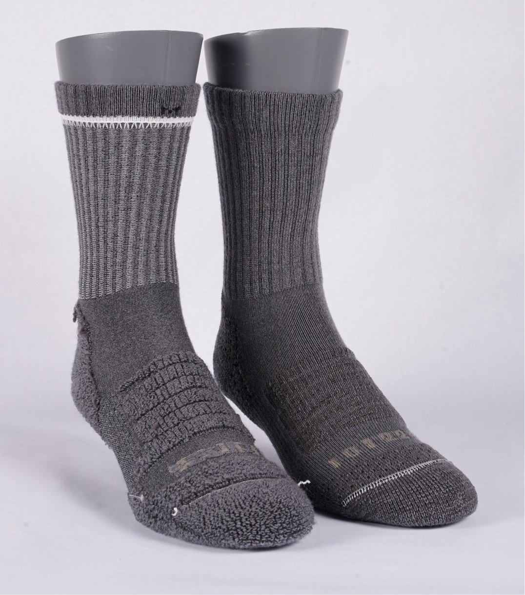 Technical performance sock utilizing targeted terry cushioning to put wool cushioning exactly where you need it for your most demanding activities. This style uses our favorite color way, newsprint: natural, undyed merino wool over black plating yarn. The toe box and heel section feature tuck stitches that create ventilation within the cushioning for breathable insulation. A meandering snake on the top of foot and timestamp complete the design.