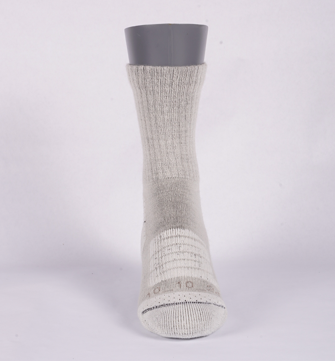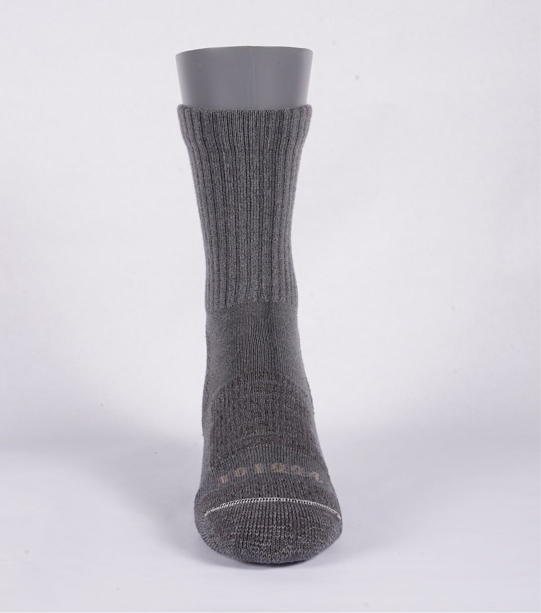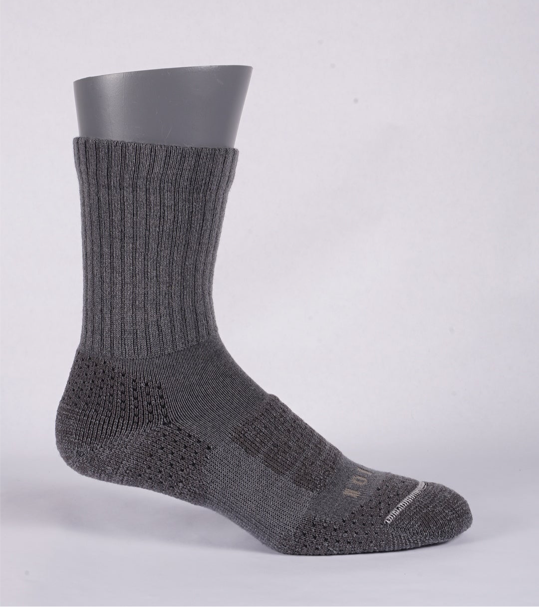 Technical performance sock utilizing targeted terry cushioning to put wool cushioning exactly where you need it for your most demanding activities. This style uses our favorite color way, newsprint: natural, undyed merino wool over black plating yarn. The toe box and heel section feature tuck stitches that create ventilation within the cushioning for breathable insulation. A meandering snake on the top of foot and timestamp complete the design.