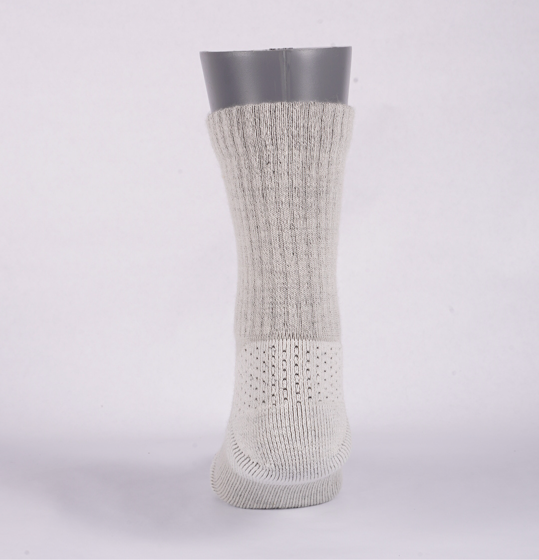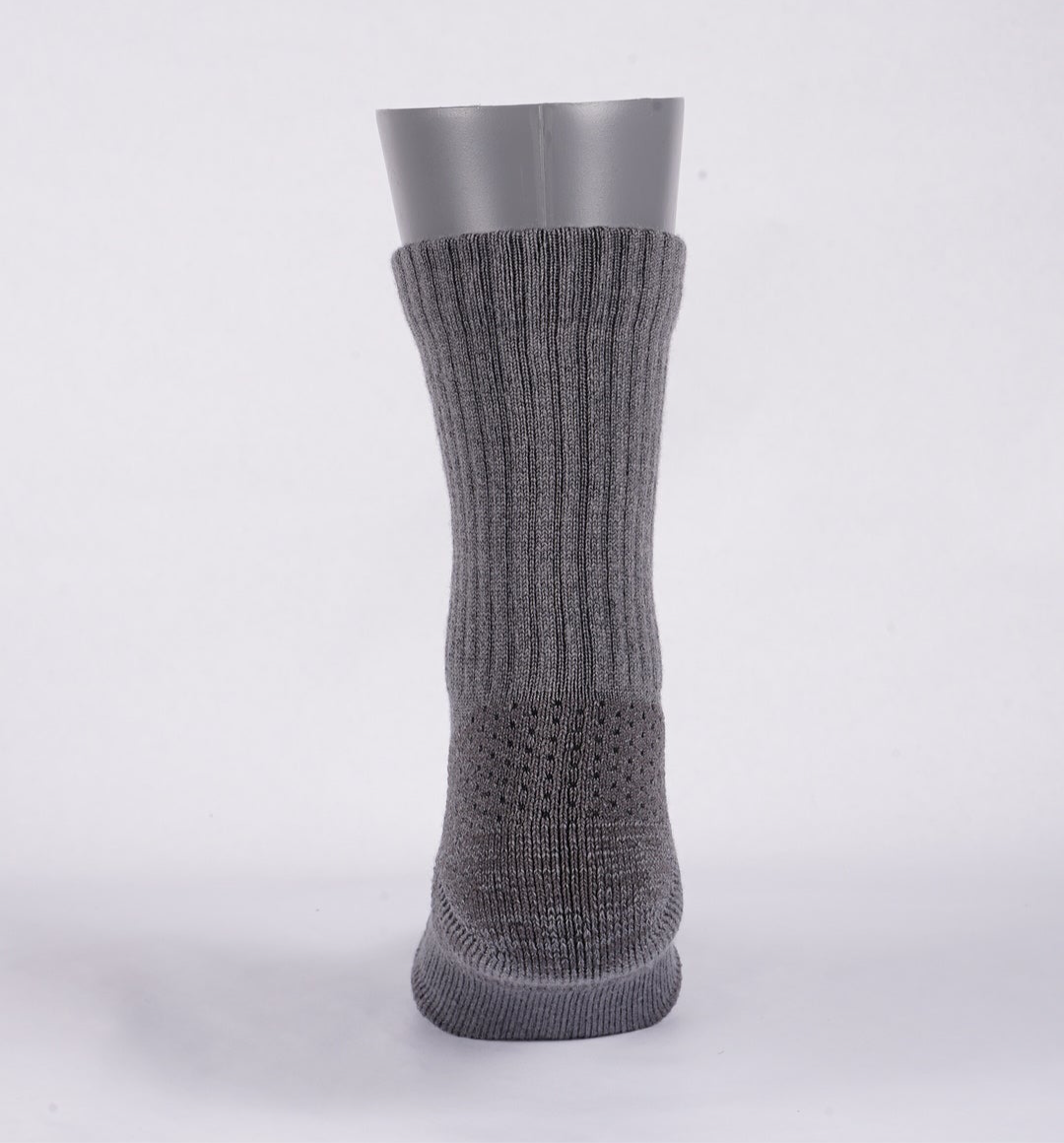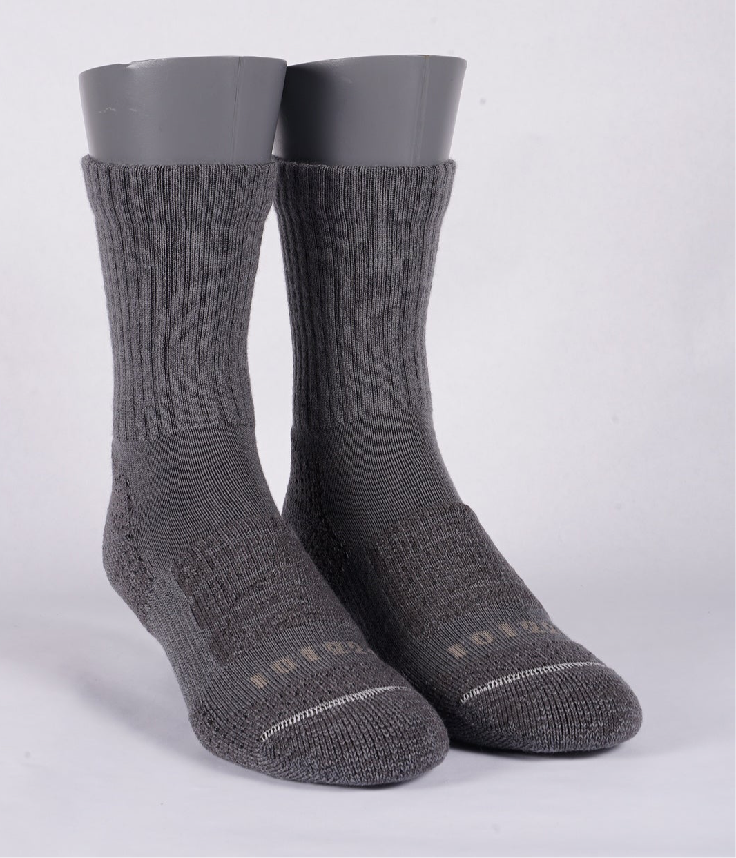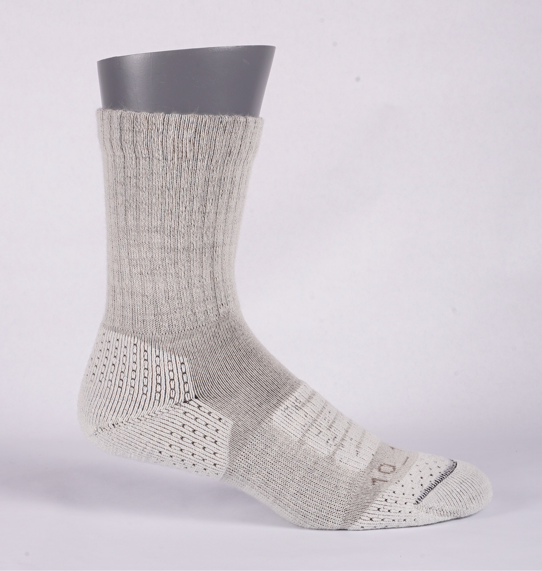 Technical performance sock utilizing targeted terry cushioning to put wool cushioning exactly where you need it for your most demanding activities. This style uses our favorite color way, newsprint: natural, undyed merino wool over black plating yarn. The toe box and heel section feature tuck stitches that create ventilation within the cushioning for breathable insulation. A meandering snake on the top of foot and timestamp complete the design.